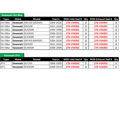 KAWASAKI KXF450 (KX450F) - 2006-2018 / KX450 4T - 2019-2026 / KX450X - 2021-2026 / KLX450R - 2008-2009 / KLF250 UTV - 2006-2009 / KFX450R ATV - 2008-2014 - INTAKE & EXHAUST - Replaces OEM # 92049-1062